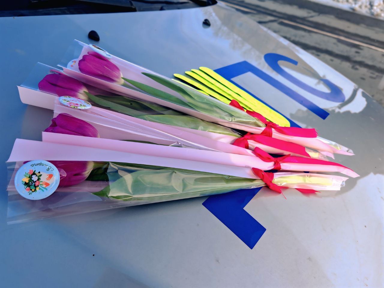 - 8 Марта. Инспекторы дорожно-патрульной службы останавливали автомобили, за рулем которых были женщины, дарили цветы и подарки. Поздравления и цветы получили